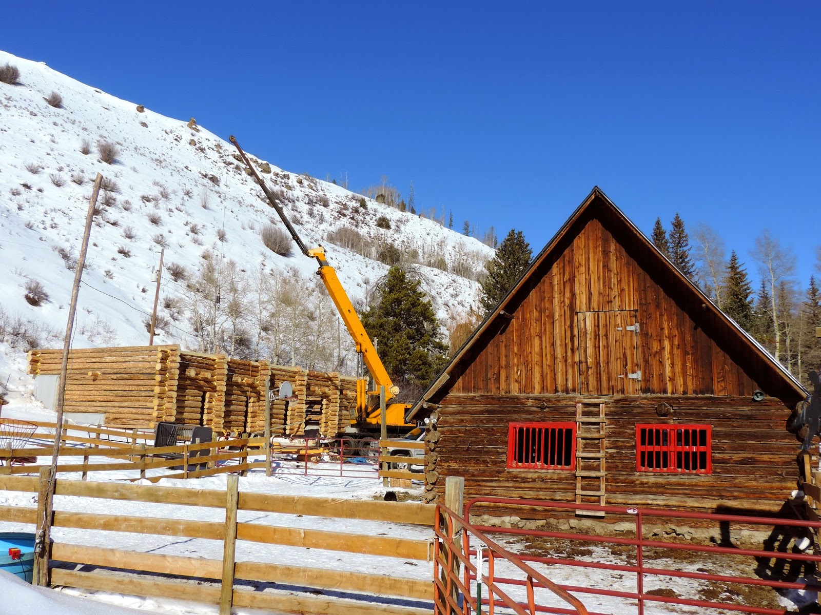 The barn will be two-stories tall. The floor of the second story served as a sun deck and construction site for more log design. The roof of the second story will be supported by full log beams. |