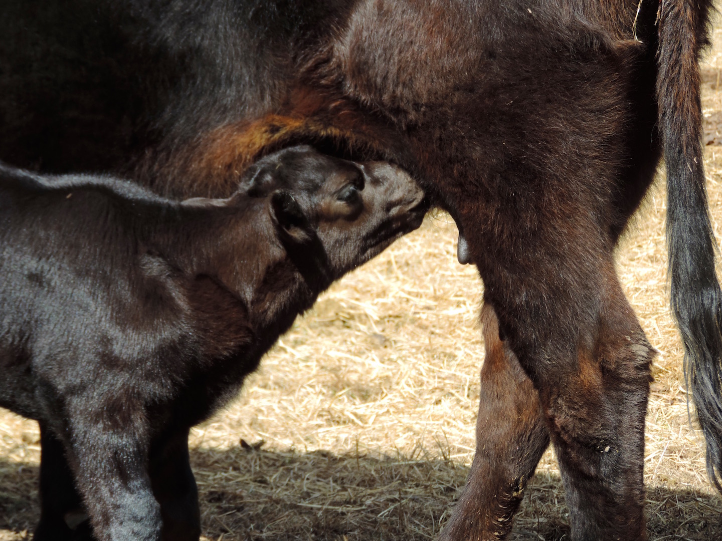 Usually the process of a cow birthing her calf is something that nature takes care of just fine. The cow will go off on her own, lay down in what is usually a dry and protected place, and, a few hours later, she has a calf. We then check that the calf and cow are healthy: a new calf should be dry and able to stand and nurse the mother shortly after birth and the mother should be able to stand and allow her calf to nurse.