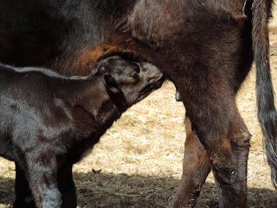 After a cow has her calf, she is instictively protective. Some of our cows are friendly enough to let us get close enough to put an ear tag on their calf without much protest while others have to be tricked with grain or separated before we can tag and check the calf. Either way, all the cows watch us carefully as we walk through their nursery.